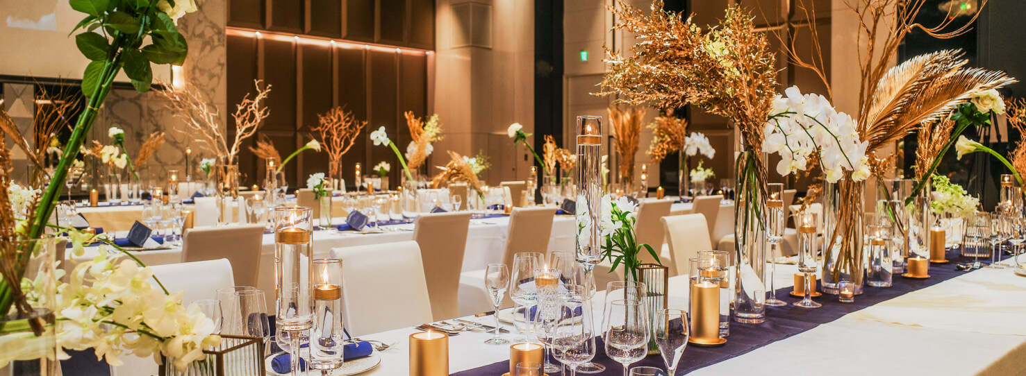 それらを、主役である料理をより引き立てるため、技巧的なことはせず、シンプルに飾りつけています。カラーリングは、港町・横浜を連想させるネイビーと、ホテルが放つ高貴さのホワイト、ゴールドを組み合わせ、開業5周年にふさわしいラグジュアリーなテイストに仕上げました。